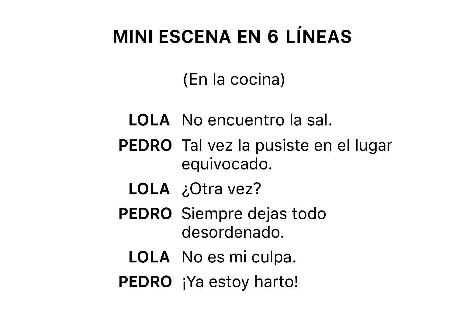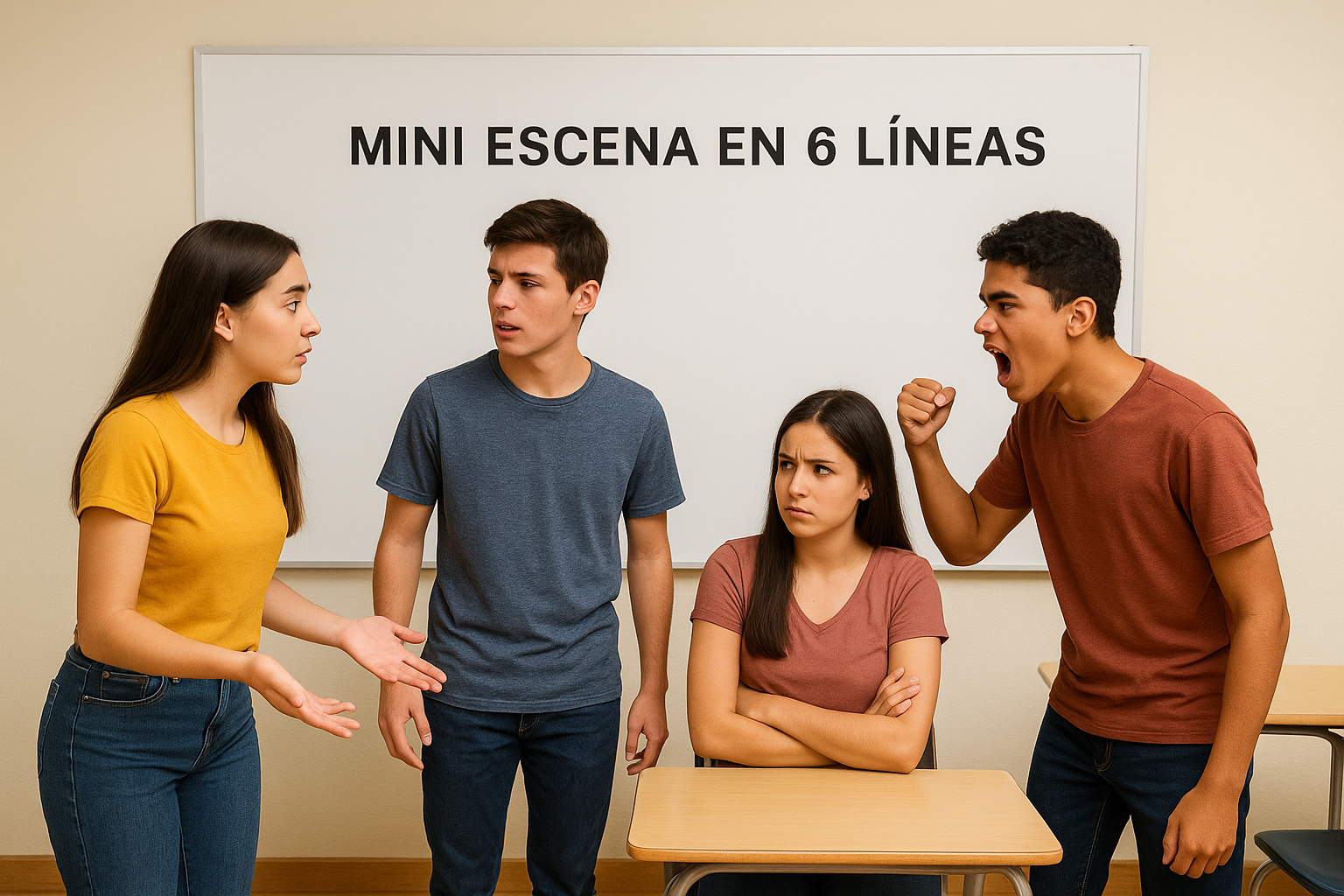 ChatGPT. (2025). Estudiantes representando mini escenas dramáticas y Mini escena en 6 líneas [Imagen generada por IA]. OpenAI.